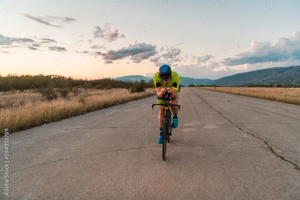 Triathlete riding his bicycle during sunset, preparing for a marathon. The warm colors of the sky provide a beautiful backdrop for his determined and focused effort.