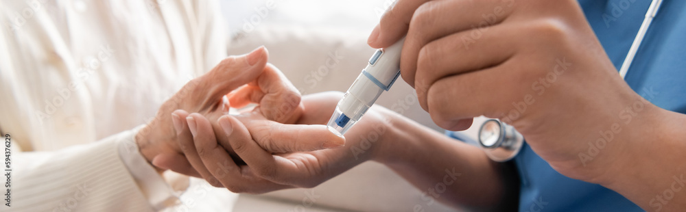 cropped view of multiracial nurse taking blood sample of senior woman with lancet pen, banner.
