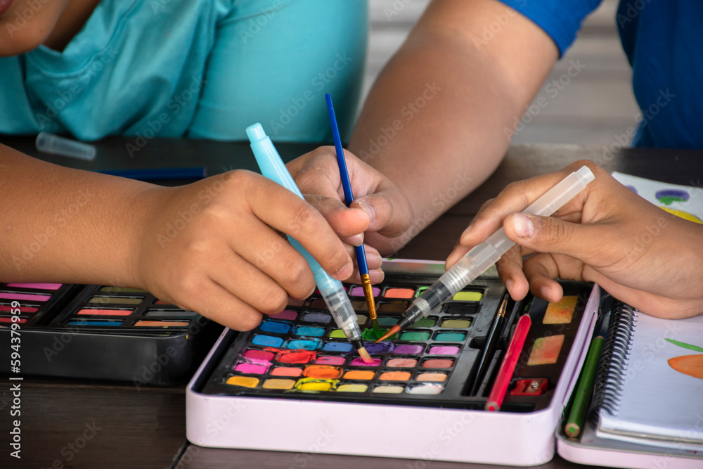 Closeup watercolor cases and hands of asian boys which spending their free times by drawing, sketching, coloring in the backyard of their house area, teenagers activity in summer concept.