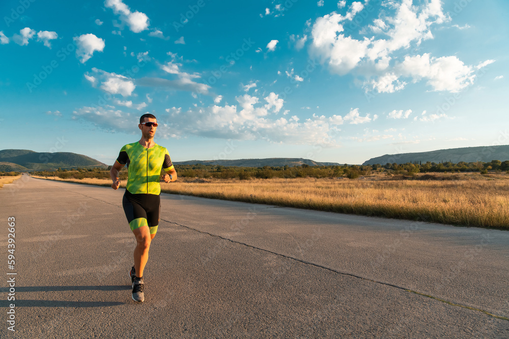 Triathlete in professional gear running early in the morning, preparing for a marathon, dedication to sport and readiness to take on the challenges of a marathon.
