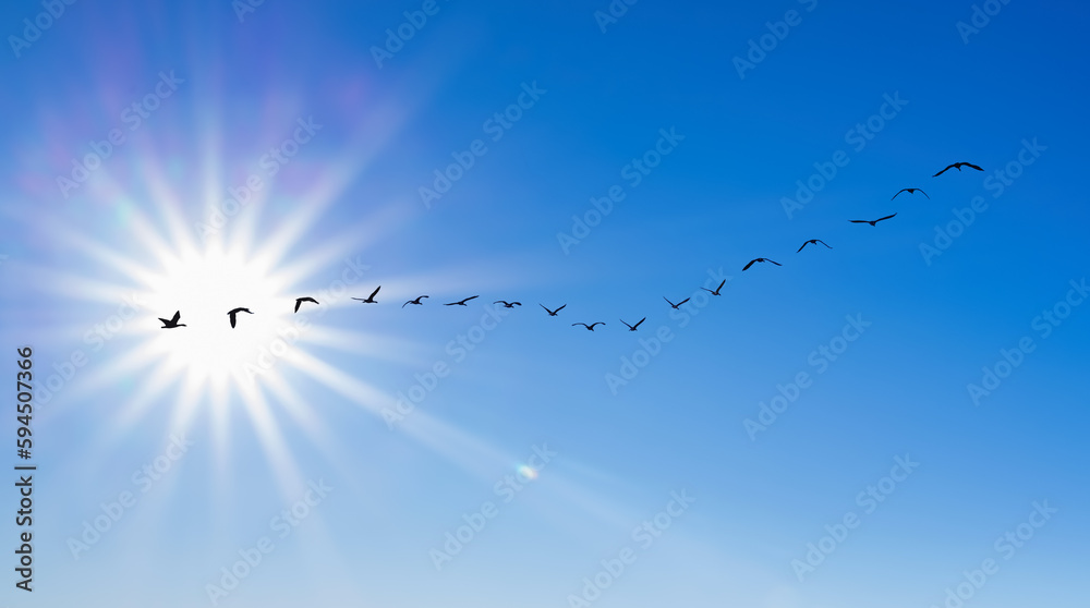 Migrating birds flying in a curved formation autumn concept
