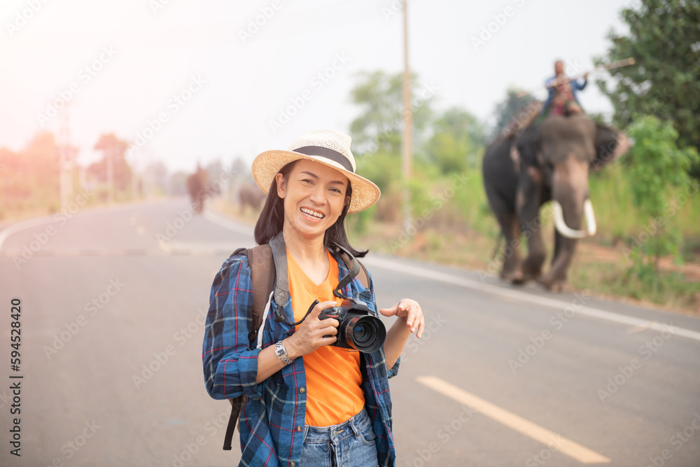 female traveler holding the camera for taking pictures. woman traveler with backpack holding hat and looking at amazing watching elephants, wanderlust travel concept, atmospheric epic moment.