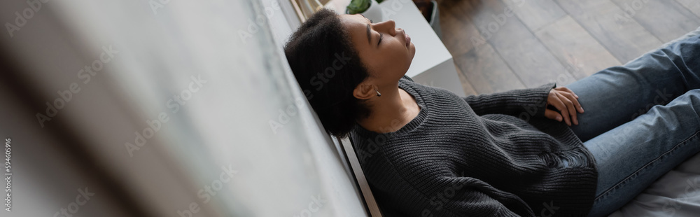 High angle view of depressed multiracial woman leaning on wall while sitting on bed at home, banner.