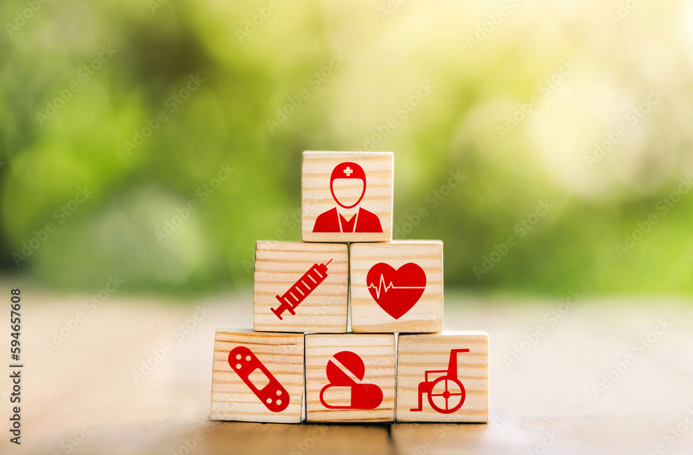 Lay out wooden blocks with icons of medical health. health insurance for your health concept. Healthcare medical business, medical technology equipment icon, health care protection concept.