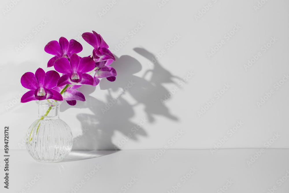 Sprig of purple orchid in vase on white background, free copy space, horizontal photo. Display on wall of blurred shadow of flower silhouette. Orchidaceae, contrast, minimalism, interior decoration.