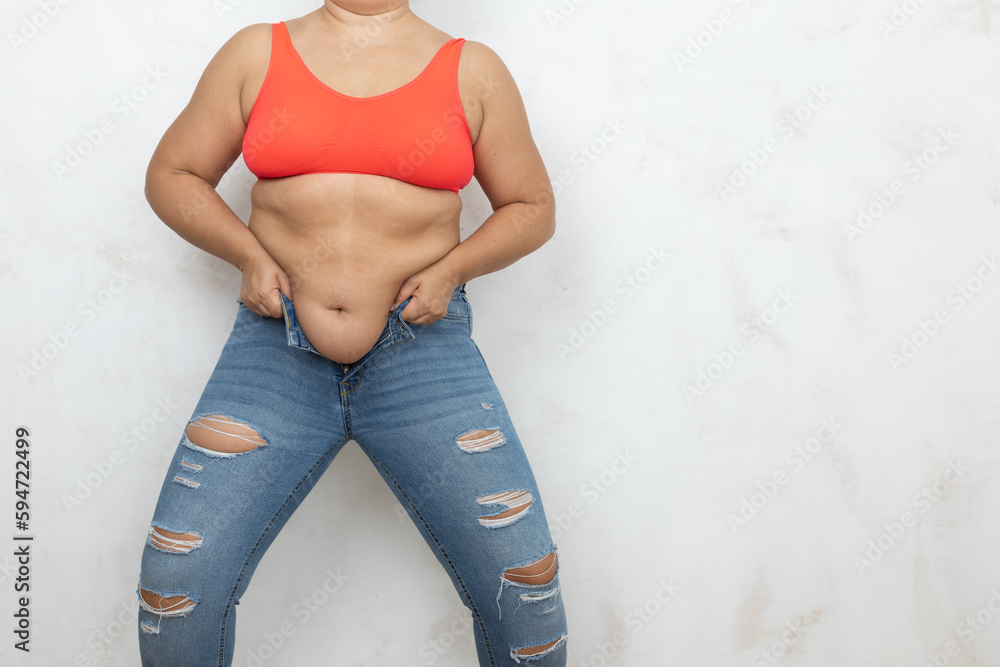 Unrecognizable adipose, fat, obese and overweight woman in red bikini pulling and getting dressed in small size tight jeans, to fit hips in clothes on white background. Preparation summer season