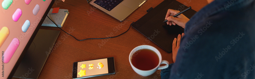 Close up of woman designer works at home drawing on graphic tablet. Freelancer working on project