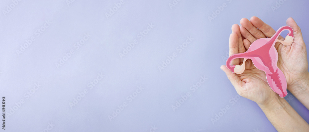 Hands holding uterus, female reproductive system , woman health, PCOS, gynecologic and cervix cancer concept
