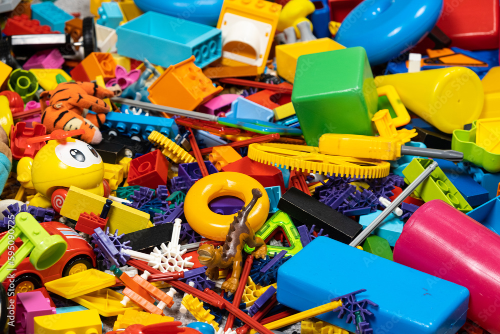 An abundance of toys in the children's room, a lot of plastic multi-colored parts from designers, spare parts for toys, figurines and cubes.