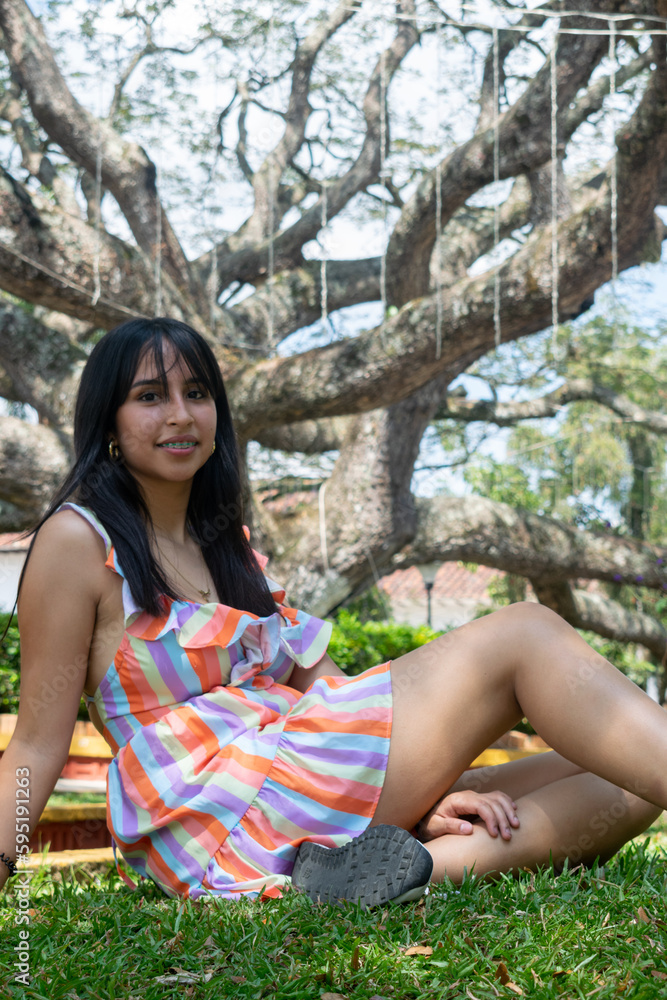 Young girl sitting in the meadow in the park wearing a dress. In the background the big village tree in Charala, Santander, Colombia.