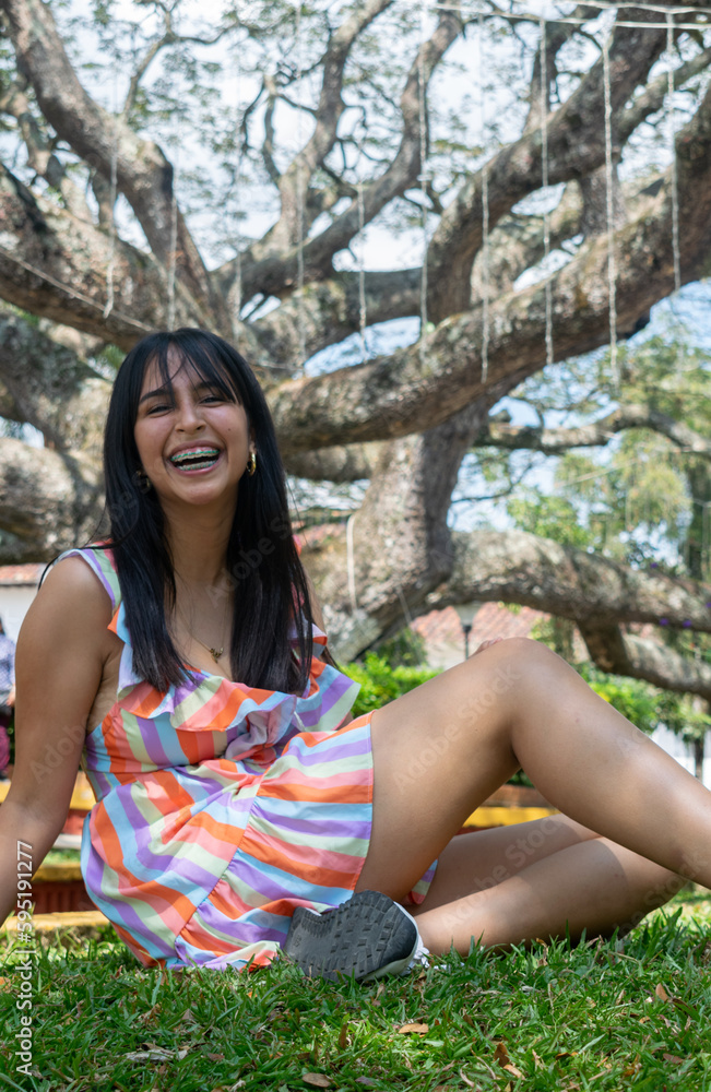 Young girl sitting in the meadow in the park wearing a dress. In the background the big village tree in Charala, Santander, Colombia. Beautiful latin girl happy and laughing.