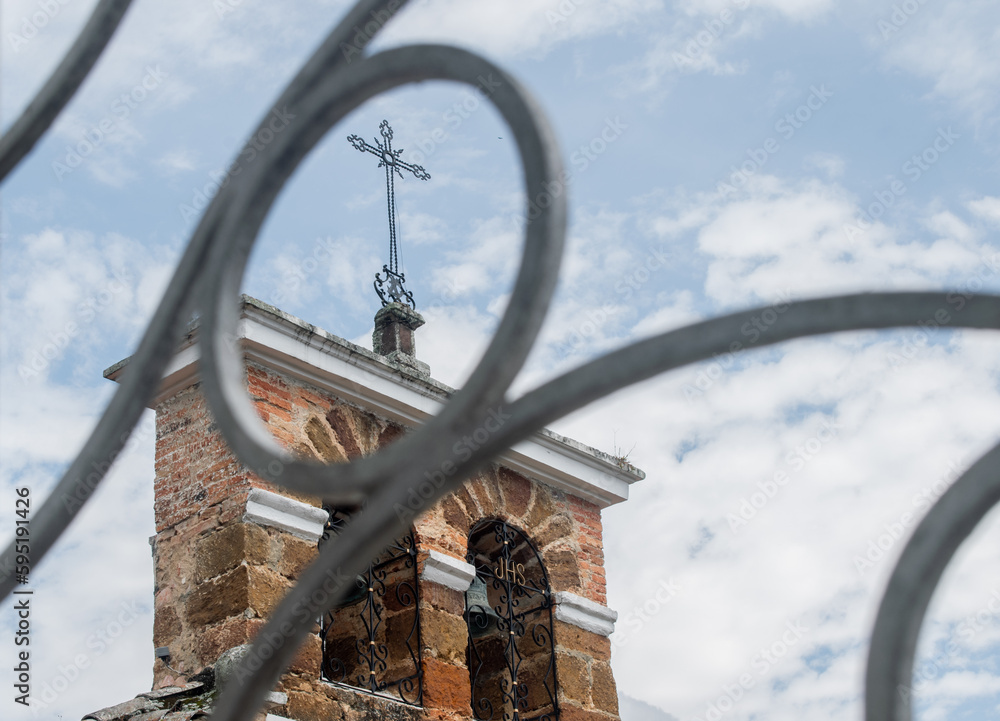 Bell tower of the old colonial church in charala, santander, colombia. Framed cross