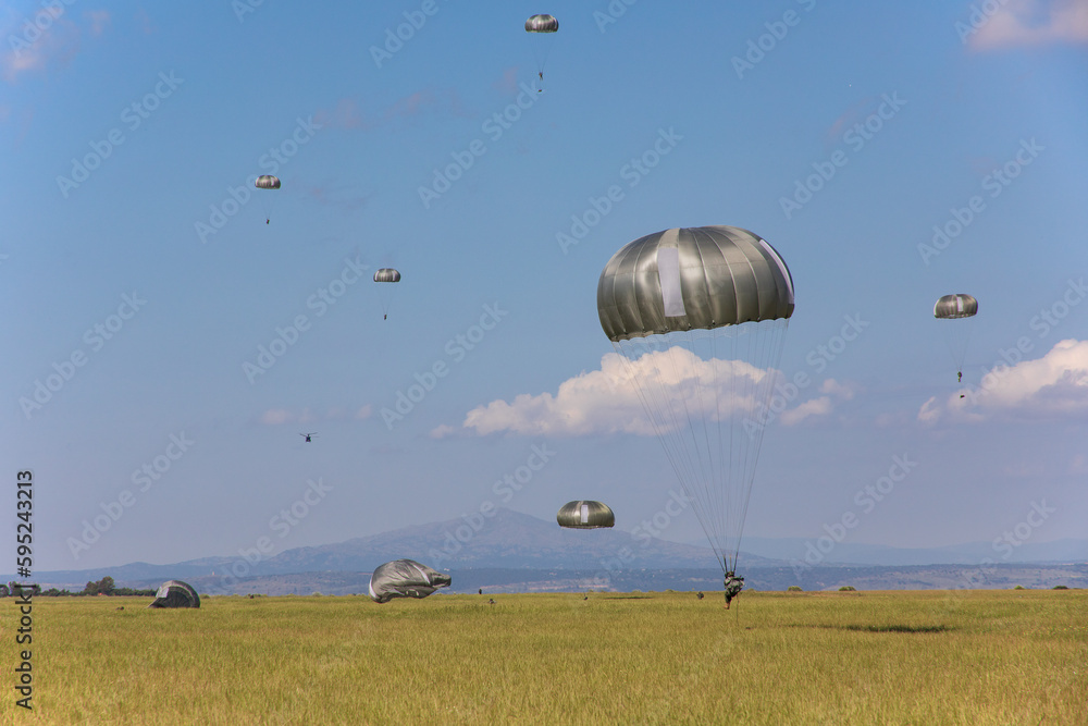 Un grupo de soldados paracaidistas toman tierra en el campo durante unas maniobras.