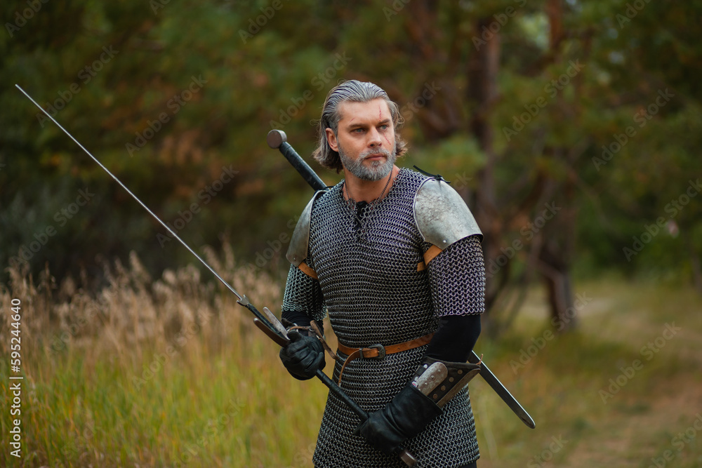 an old warrior in chain mail with a sword is looking for prey in the forest.