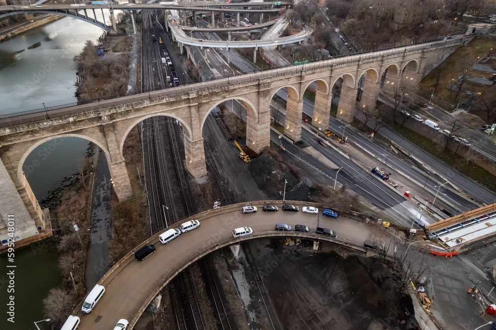 Aerial view over the Highbridge walkway, which crosses the Harlem River in New York during sunrise.
