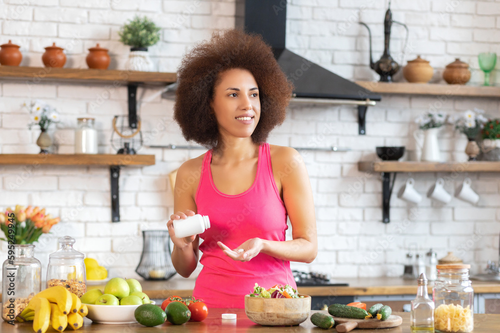 Happy african american woman standing at the cuisine table in the home kitchen drinking dietary supplements, looking away and smiling friendly, healthy lifestyle concept