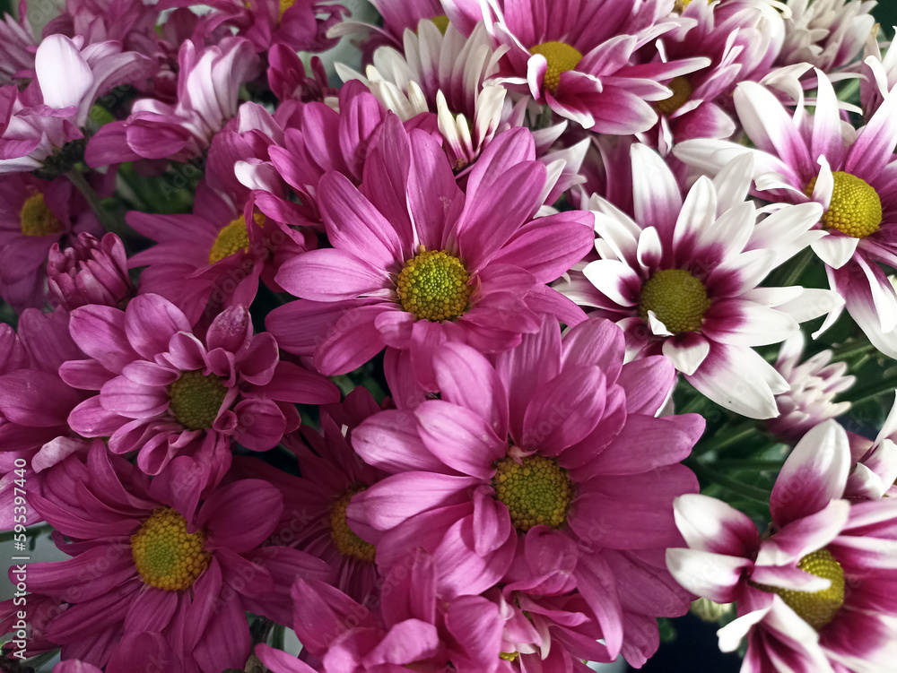 Detail view of a bunch of purple chrysanthemum flowers with purple and white petals. Floral pattern backgrounds. Natural spring flower background.