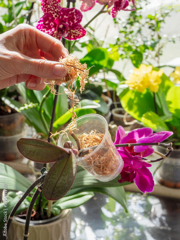 Vertical view of laying moss in a pot. Baby orchid seedling in a transparent container with moss. Orchid breeding. Indoor floriculture. Copy space.