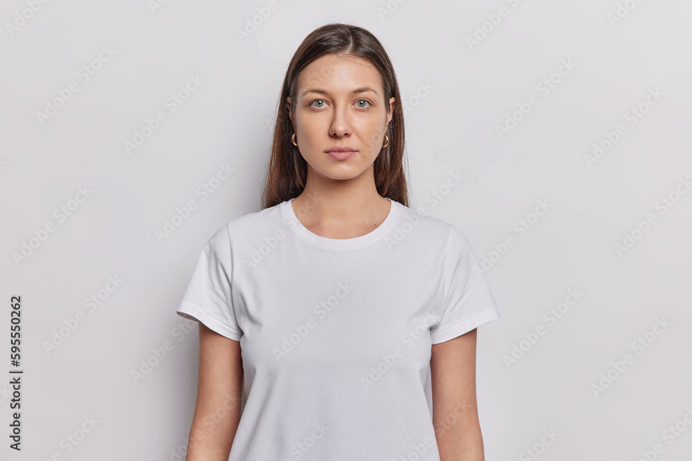 Waist up shot of nice looking woman has dark hair dressed in basic t shirt keeps arms down looks directly at camera isolated on white background. Brunette female model poses in studio for making photo