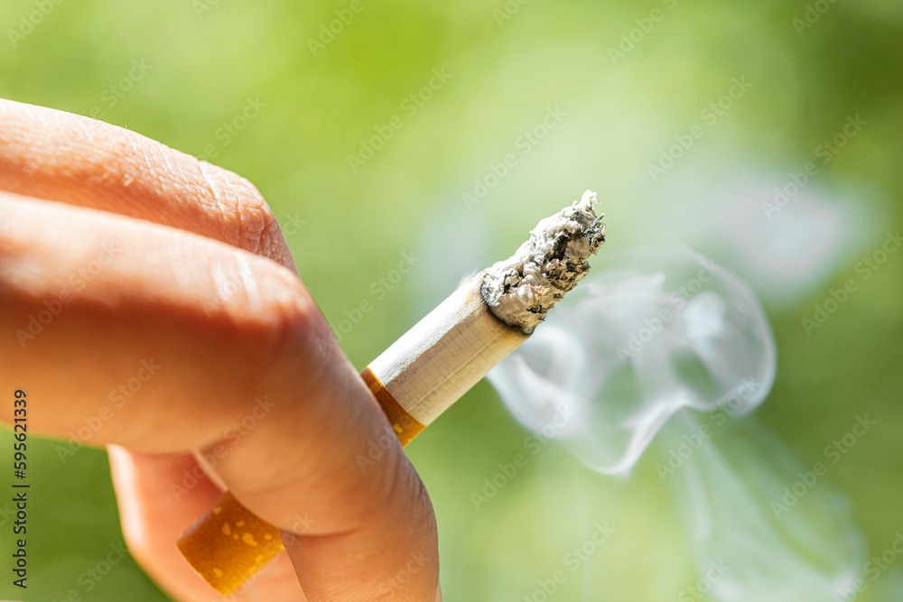 cigarette smoking consumable. Smoking addiction concept. Smoking woman with background of nature and danger by fire. Close up view and copy space of cigarette with smoke and ash