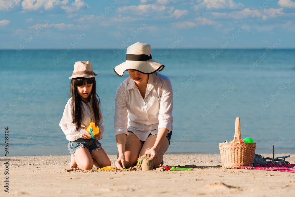 Happy Asian mother and her daughter playing sand together having fun and enjoying on the tropical beach in summer vacation.