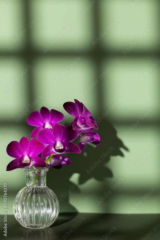 Sprig of purple orchid in transparent vase on olive color background, free copy space. Flower silhouette and clearly visible shadow mesh on wall. Orchidaceae, minimalist aesthetic, beautiful bloom.