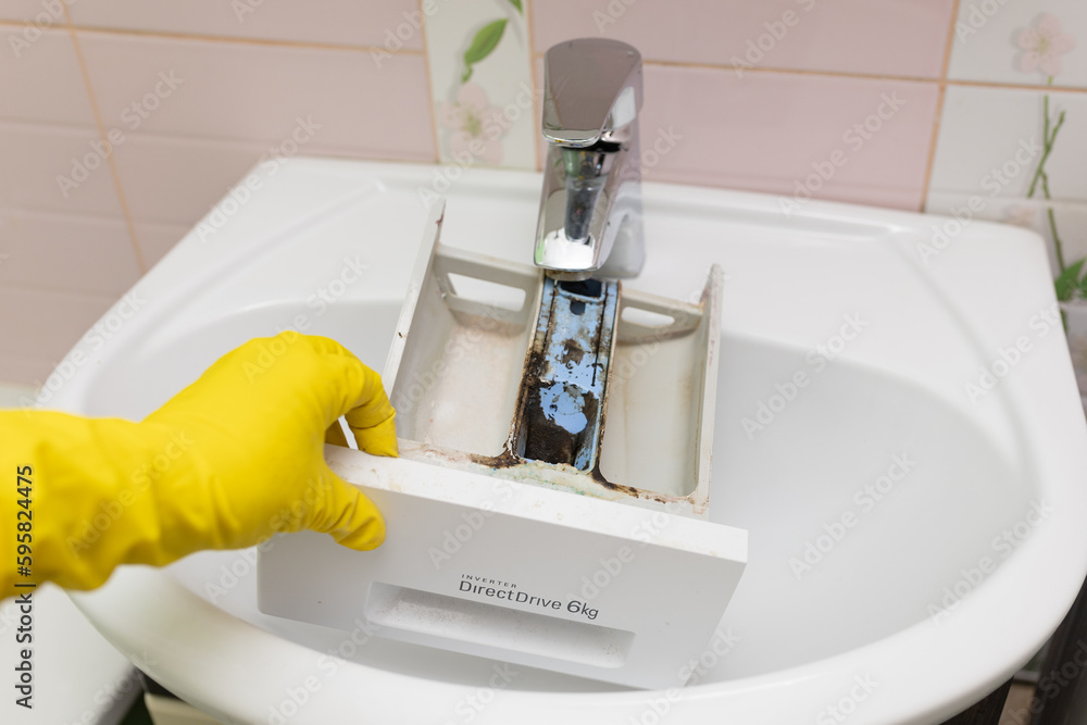 Close up cropped hand in yellow glove washing and cleaning dirty laundry machine dispenser for wash powder and liquid detergent with dregs and corrosion under tap water in sink in bathroom. High angle