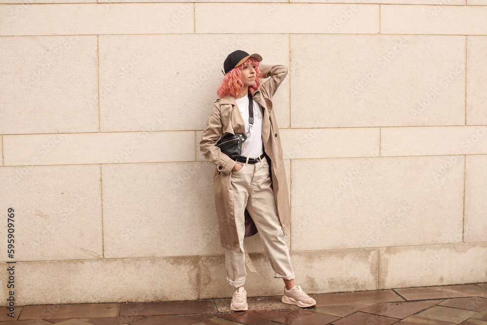 Portrait shooting of a stylish girl with pink hair. Beige shades. Trends of spring and summer 2023. Beige trench cloak with white t-shirt and beige pants. Black small belt bag. Black cap