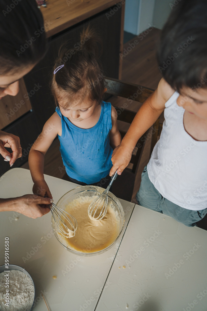 Top view image of two beautiful kids kneading dough and smiling while baking in kitchen. Family, cooking, baking and people concept