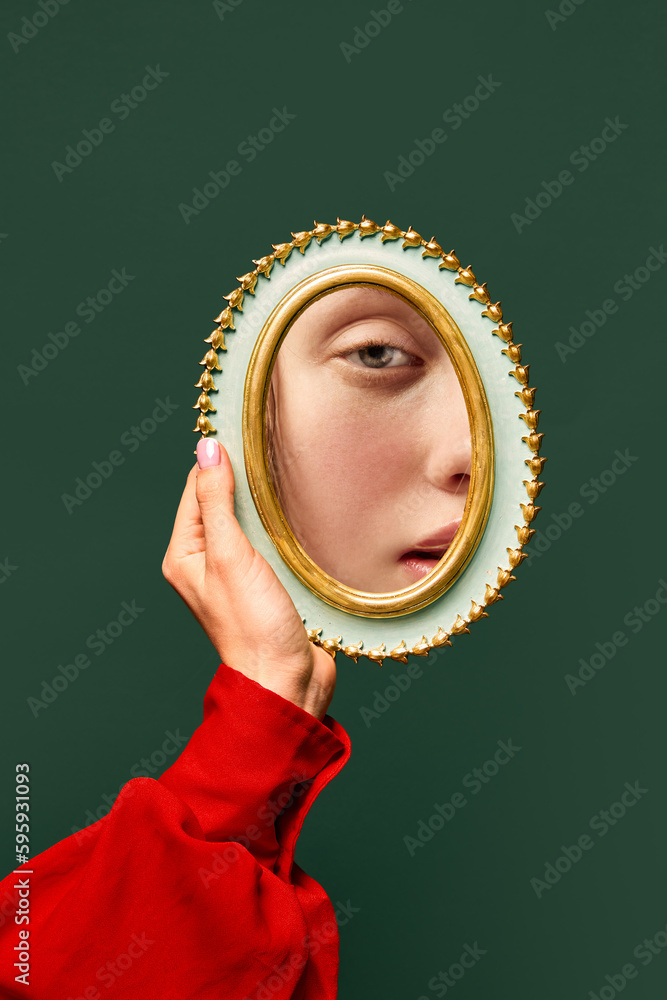 Female hand holding small mirror with reflection of sad woman's face with natural make up over dark green background. Human emotions, expression