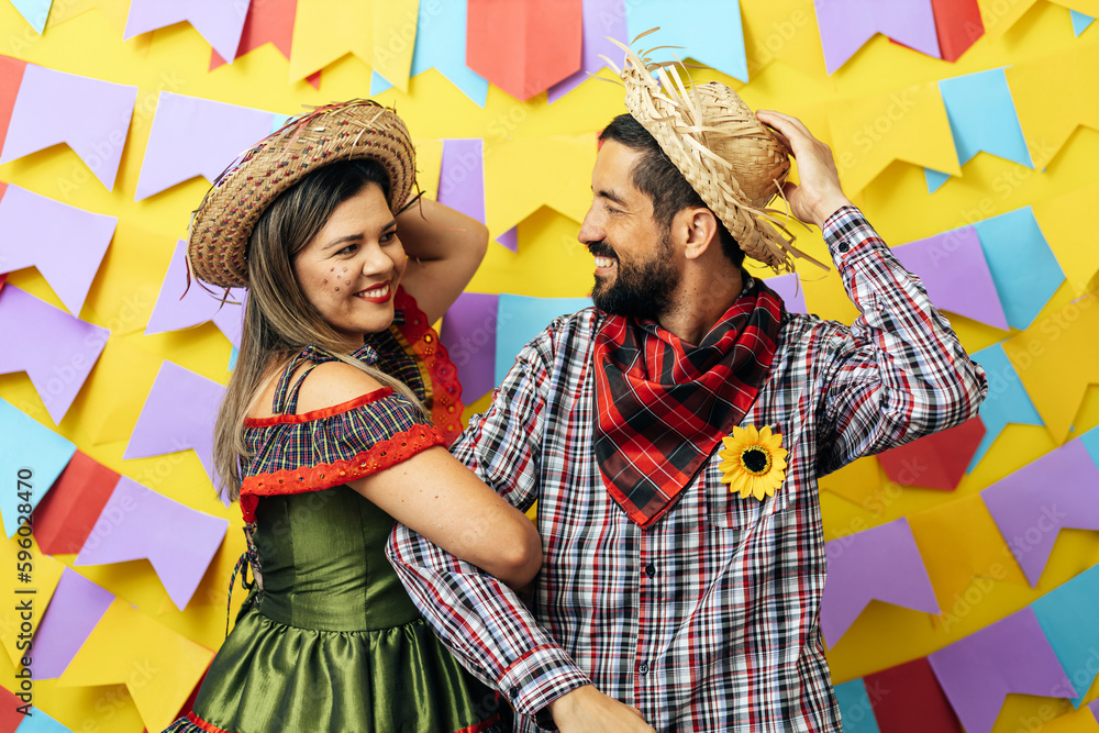 Brazilian couple wearing traditional clothes for Festa Junina - June festival - dancing over colorful background with pennants