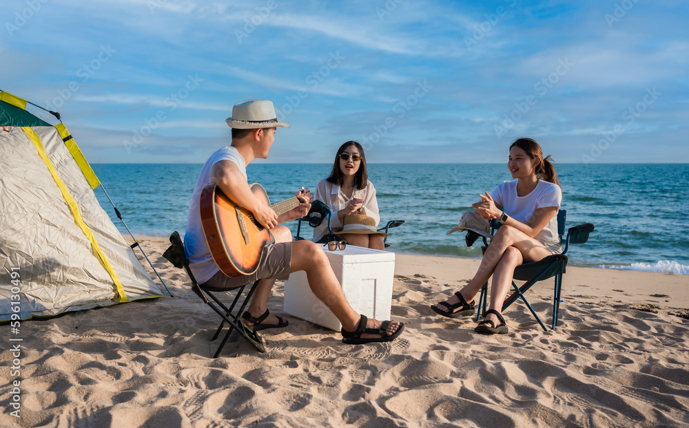 Group of happy Asian friends playing guitar and singing with clapping together having fun and enjoying while camping picnic on the beach in summer vacation.
