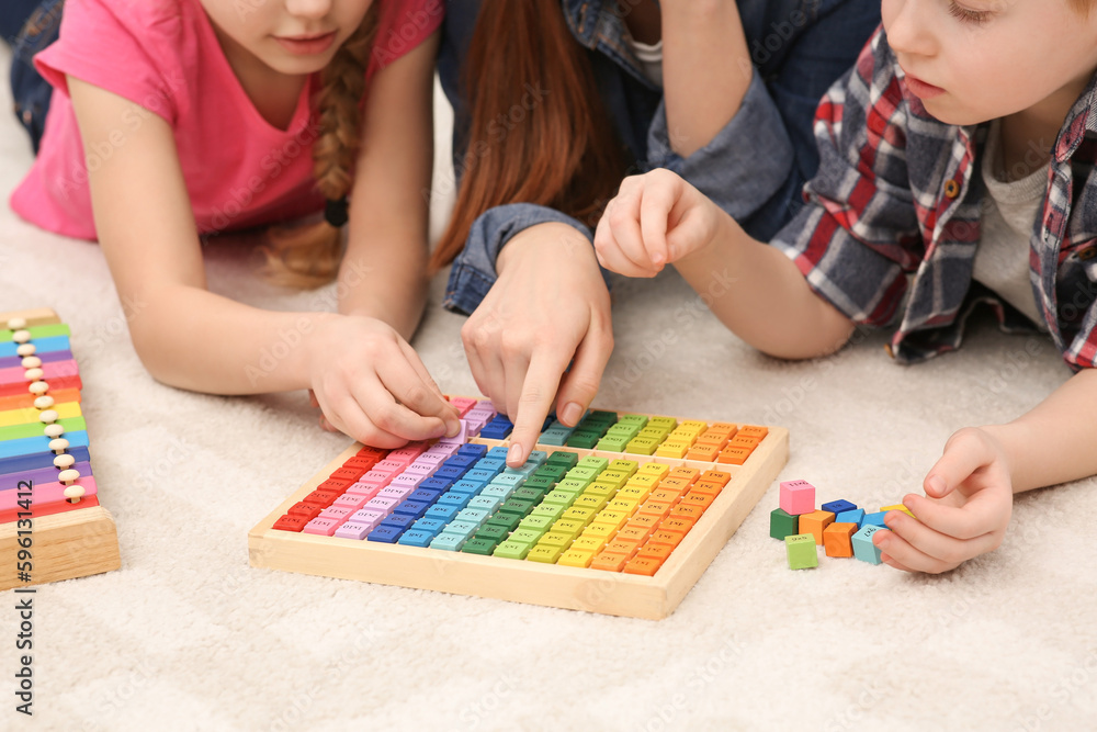 Mother and children playing with different colorful cubes and equations on floor, closeup. Learning mathematics with fun