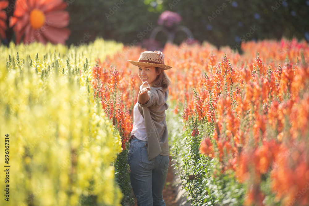 Beautiful woman enjoying flowers field, nice female lying down in meadow of flowers, pretty girl relaxing outdoor, having fun, happy young lady and spring green nature, Freedom concept.