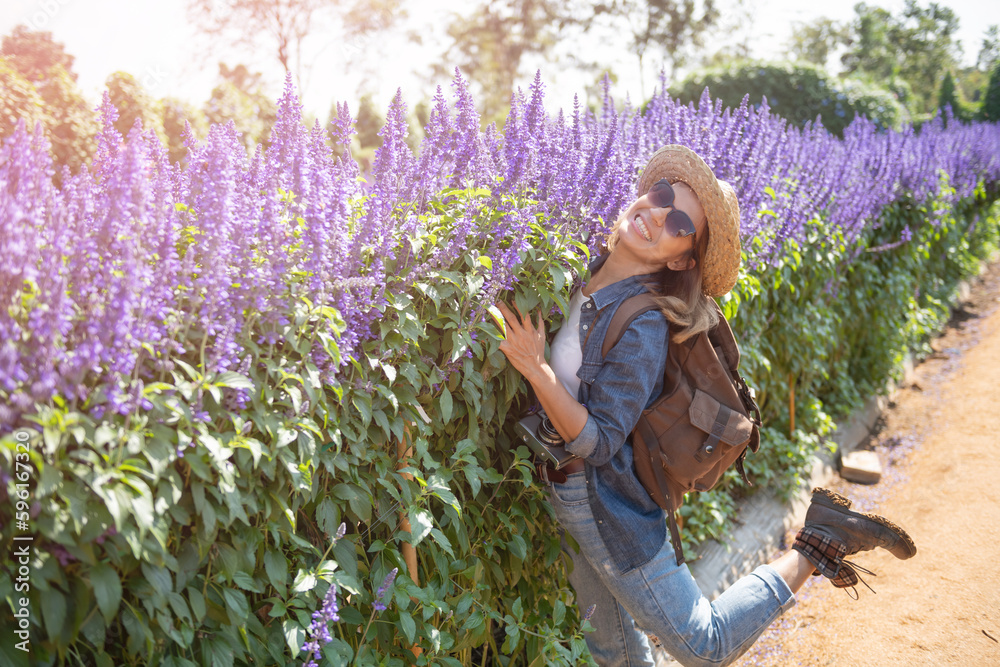 Beautiful woman enjoying flowers field, nice female lying down in meadow of flowers, pretty girl relaxing outdoor, having fun, happy young lady and spring green nature, Freedom concept.