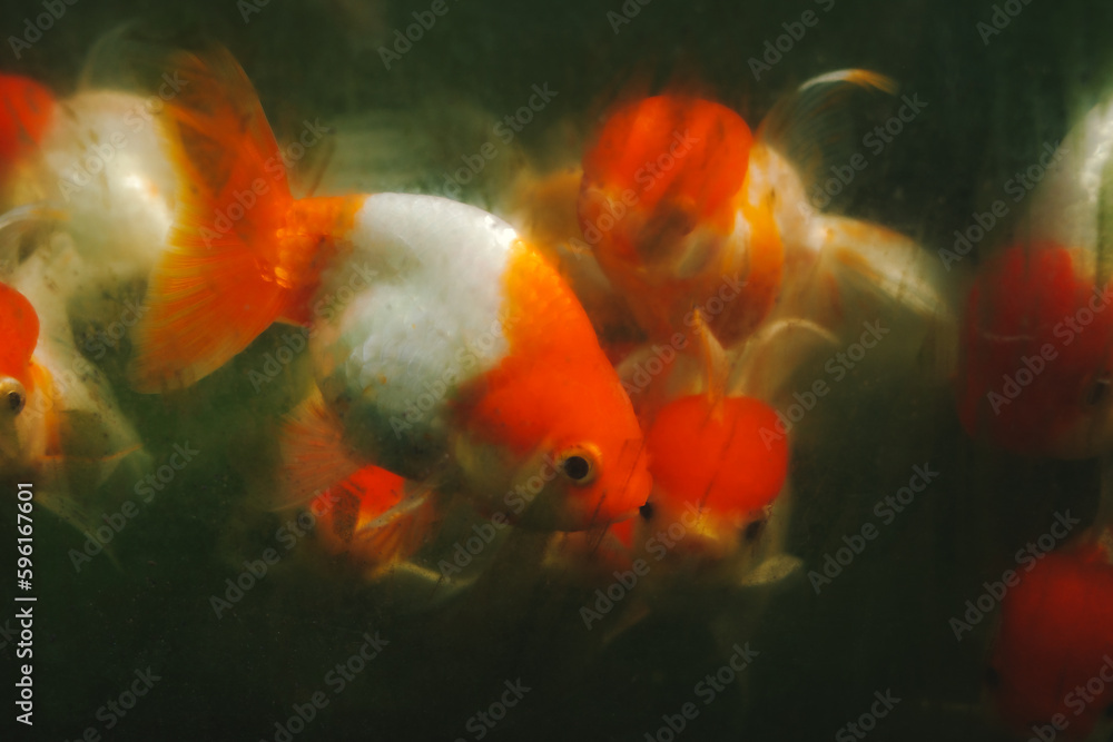 Close up and select focus golden fish in dirty mirror tank