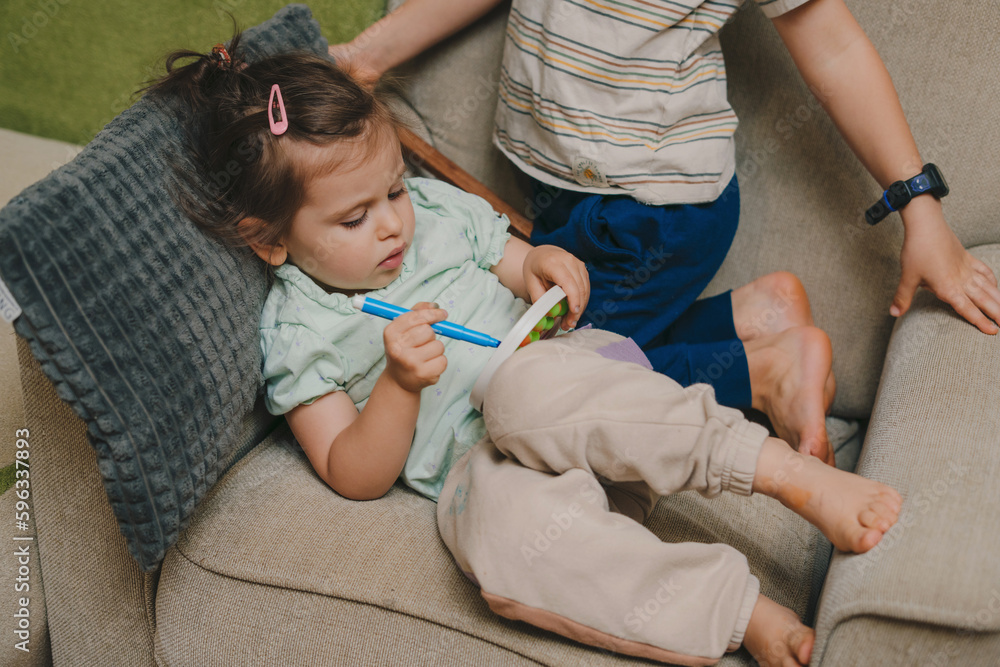 Little caucasian baby girl learning to hold a pencil and drawing on a paper lying on sofa in the living room with her brother. Young person holding pencil