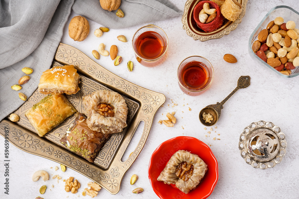 Tray with tasty baklava and glasses of Turkish tea on light background