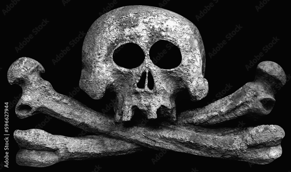 An ancient stone statuue of human skull as symbol of death and horror on bkack background.