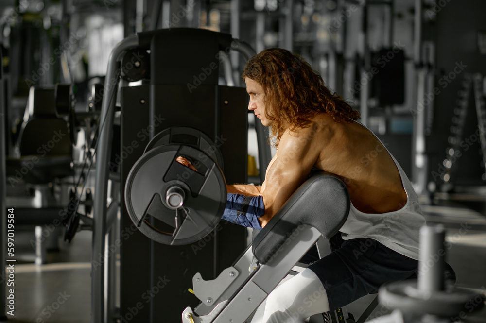 Man bodybuilder working with barbell on Scott bench at gym