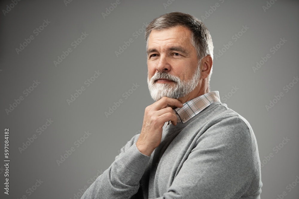 Portrait of happy casual mature man smiling, senior age man with gray hair, Isolated on gray background