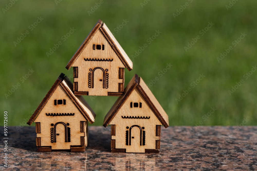 Miniature wooden houses on the background of the lawn on a sunny day