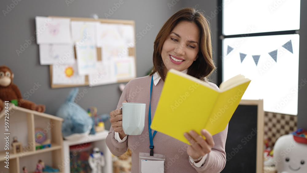 Young beautiful hispanic woman preschool teacher drinking coffee reading book at kindergarten