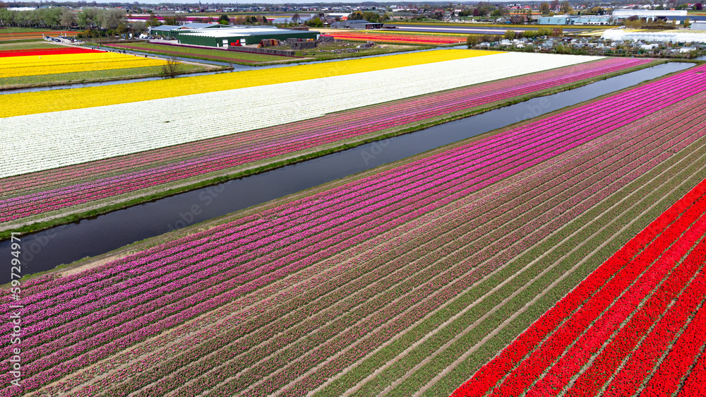 Tulip fields with reds, yellows, greens, purples and oranges in full bloom near Amsterdam (Bollenstreek), Holland, The Netherlands