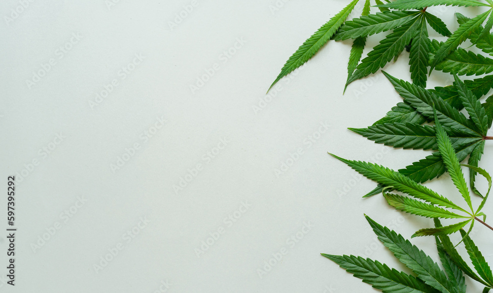 close up top view on cannabis leaves and branches on white background for alternative medical and marketing design concept