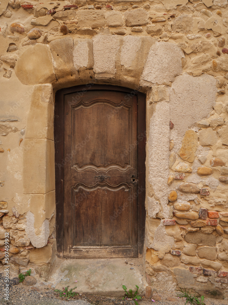 Vielle porte en bois avec mur en pierre