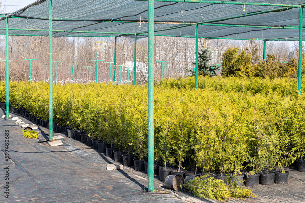 Thuja plant in a pot in a garden seedling nursery.