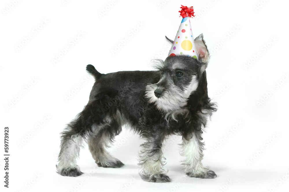 Birthday Hat Wearing Miniature Schnauzer Puppy Dog on White