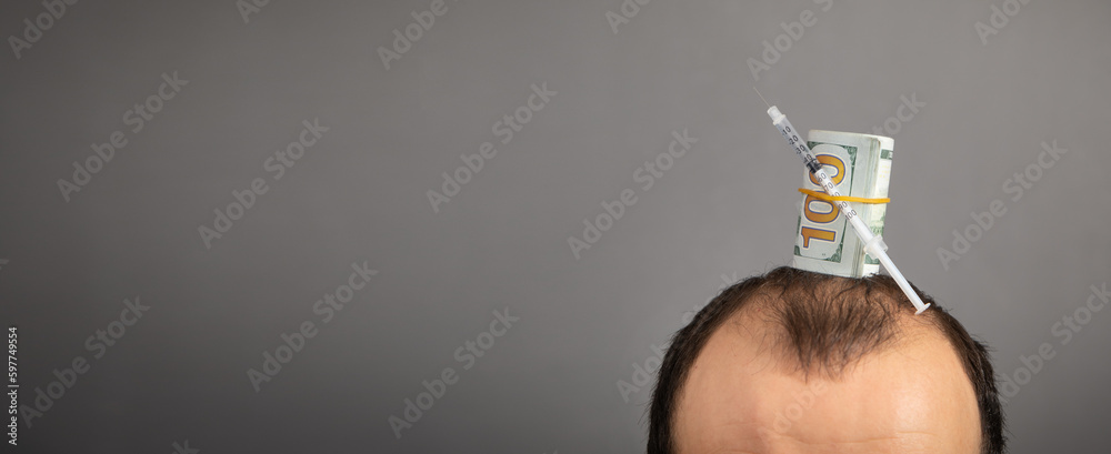 Caucasian man with a syringe and money. Money for hair transplantation. Hair loss problem