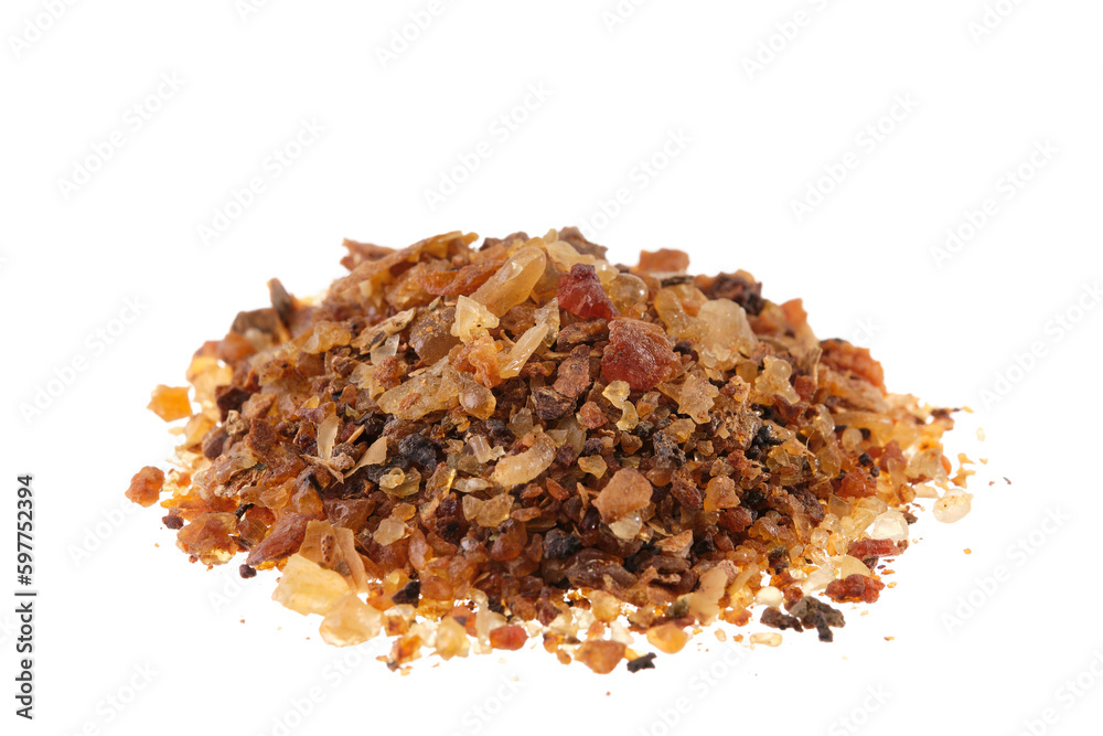 Pile of myrrh resin (Commiphora myrrha), isolated on white background